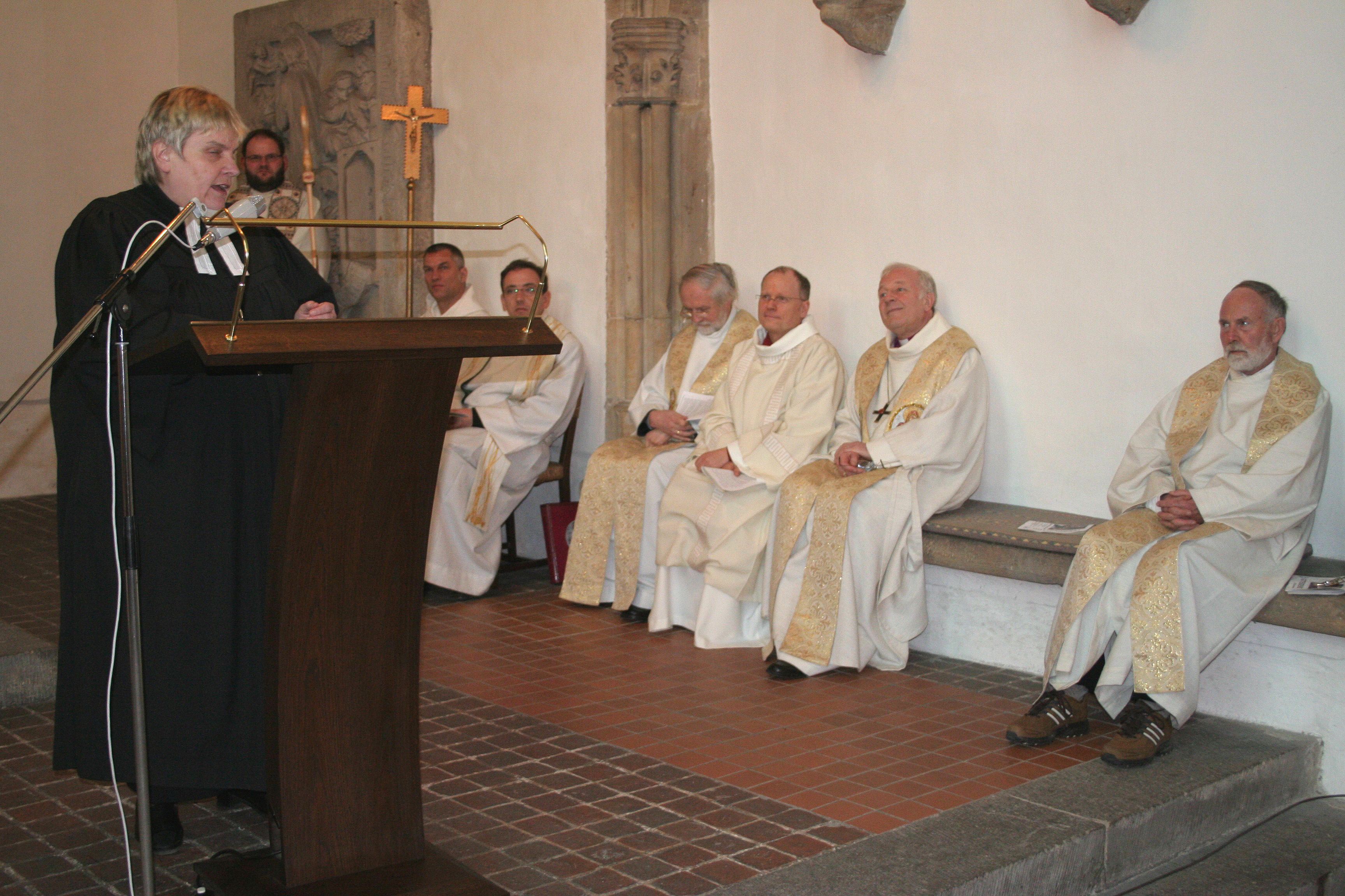 Die evangelische Oberkirchenrätin Marita Krüger spricht als Vorsitzende der ACK Thüringen und als Vertreterin des Landesbischofs der Evangelisch-Lutherischen Kirche in Thüringen ein Grußwort.