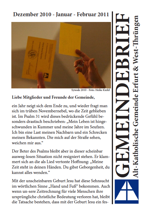 Ab sofort ist der Gemeindebrief Winter 2010/2011 sowohl für die Gemeinde Erfurt wie auch für die Gemeinde Kassel online als pdf verfügbar.