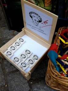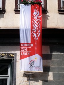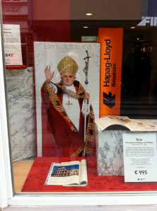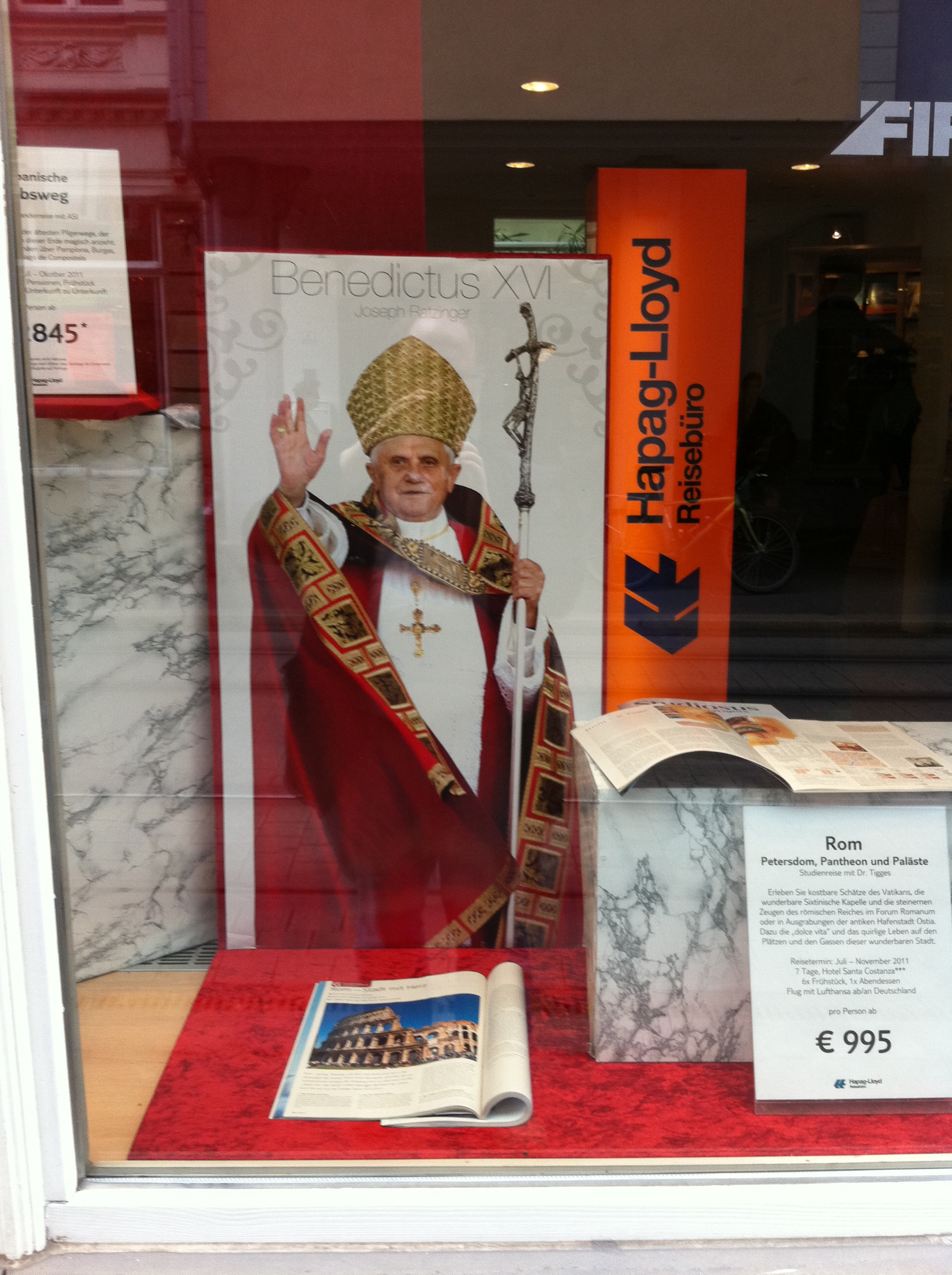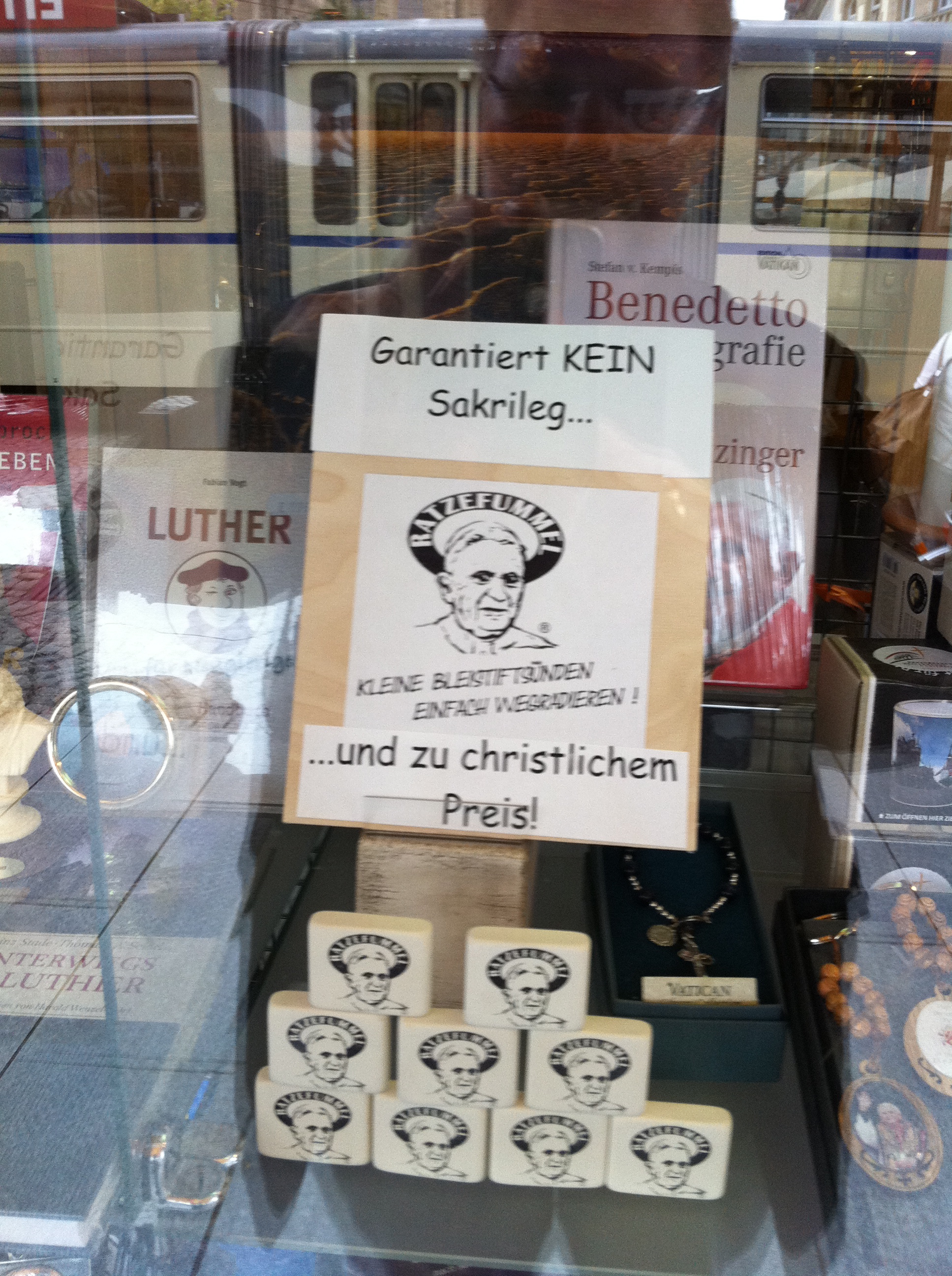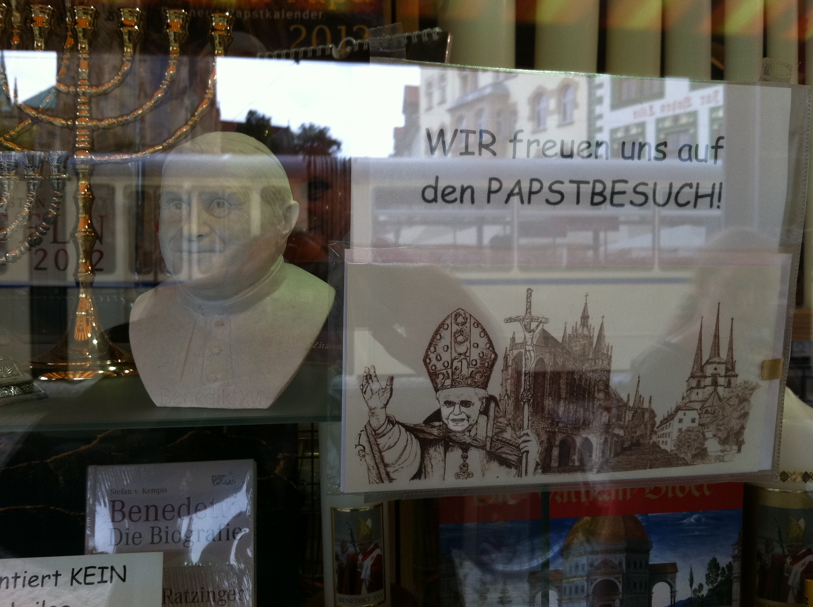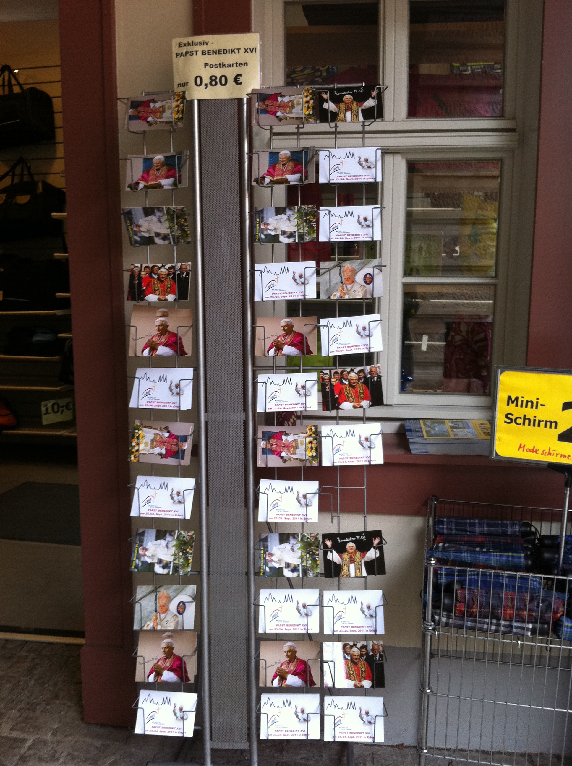 Buchhandlung hat ein kleines Extra-Regal reserviert – in trauter Zweisamkeit u.a. mit dem kritischen Theologen Hans Küng …). Auf der Krämer-Brücke können Interessierte einen ‚Original Ratzefummel’ erstehen, mit dem „Kleine Bleistiftsünden einfach wegradiert“ werden können (soll es bereits 2006 bei seinem Besuch in Bayern gegeben haben). Und je näher man dem Domplatz kommt, desto mehr intensivieren sich die Möglichkeiten sich mit päpstlichen Devotionalien einzudecken: Postkarten, Kerzen, Schlüsselanhänger, Abziehbildchen, Rosenkranz mit Papstportrait, päpstliche Kühlschrankmagneten und so weiter und so weiter – besonders der Kirchenladen hat verständlicherweise ein entsprechend reichhaltiges Angebot vorrätig – direkt neben einer ganzen Reihe an Martin-Luther-Produkten. Und den Hinweis zu einer Sondermünze, extra für diesen Papstbesuch geprägt, habe ich auch schon (im Schriftenstand einer evangelischen Kirche!) gefunden …