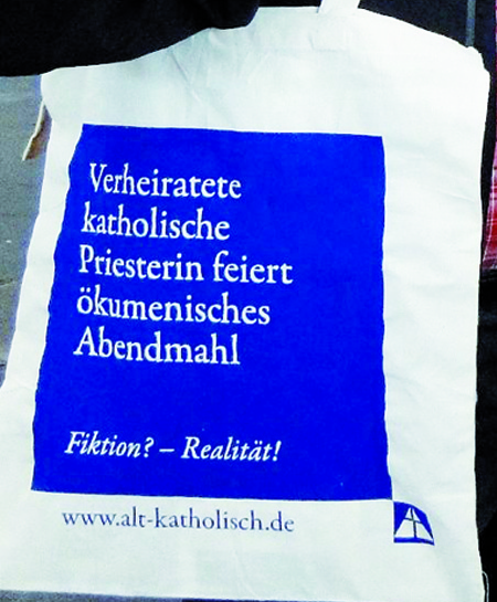 Die Baumwolltasche mit dem Aufdruck „Verheiratete katholische Priesterin feiert ökumenisches Abendmahl – Fiktion? Realität!“, die auf Kirchen- und Katholikentagen wegging wie warme Semmeln, ist wieder verfügbar.