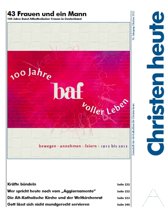 Die Oktober-Ausgabe der alt-katholischen Monatszeitschrift Christen heute hat das 100jährige Jubiläum des Bundes Alt-Katholischer Frauen (baf) als Schwerpunktthema.