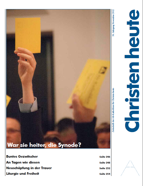 Die im Moment noch aktuelle November-Ausgabe beschäftigt sich mit einem Rückblick auf die Bistumssynode. In Anlehnung an den Titel ‚Die Heiterkeit der Synode‘ der Ausgabe von Christen heute im September, welche einen Ausblick auf die Synode gab, trägt die November-Ausgabe den Titel ‚War sie heiter, die Synode?‘.