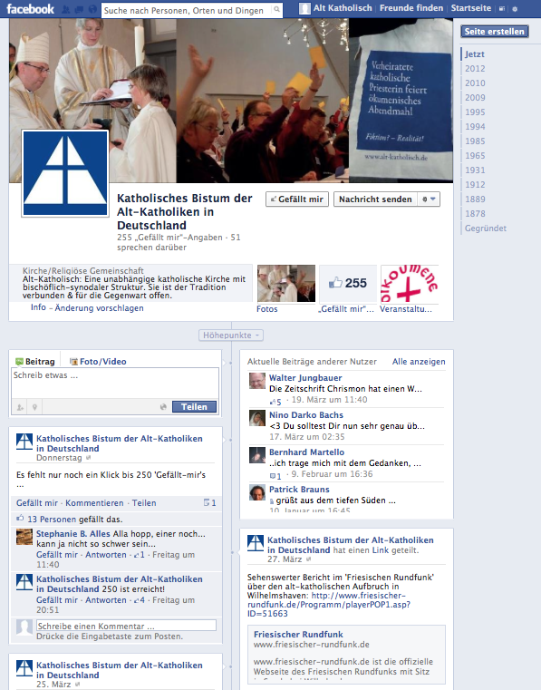 Die Facebook-Seite des Alt-Katholischen Bistums in Deutschland gewinnt immer mehr Freundinnen und Freunde. Aktuell hat die Seite bereits von 255 Personen einen ‚Gefällt mir‘-Klick erhalten.