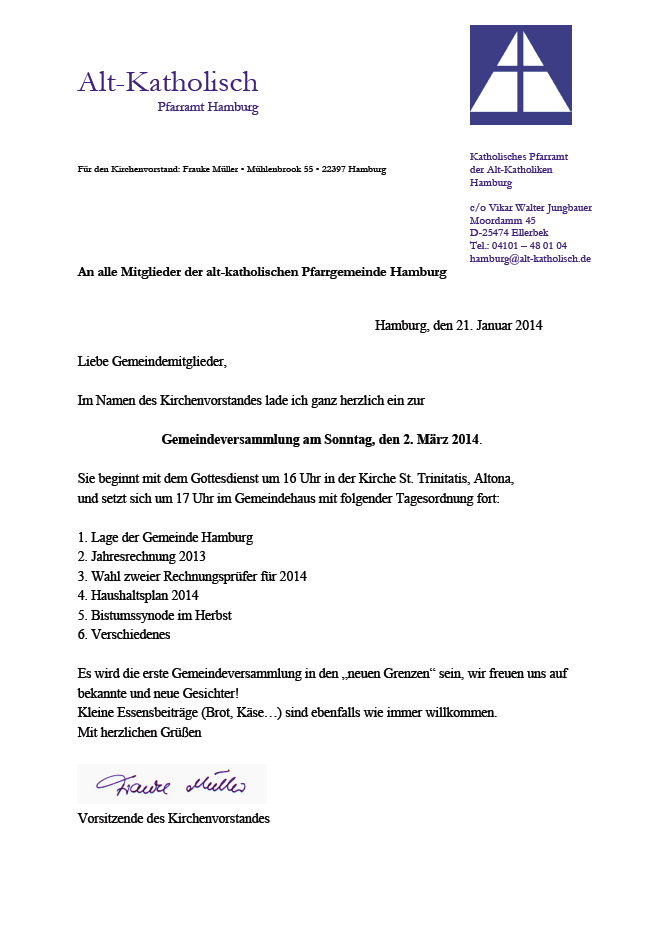 Am Sonntag, den 2. März 2014 findet eine Gemeindeversammlung der Katholischen Pfarrgemeinde der Alt-Katholiken Hamburg statt.