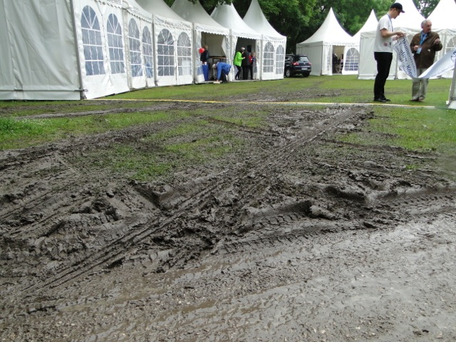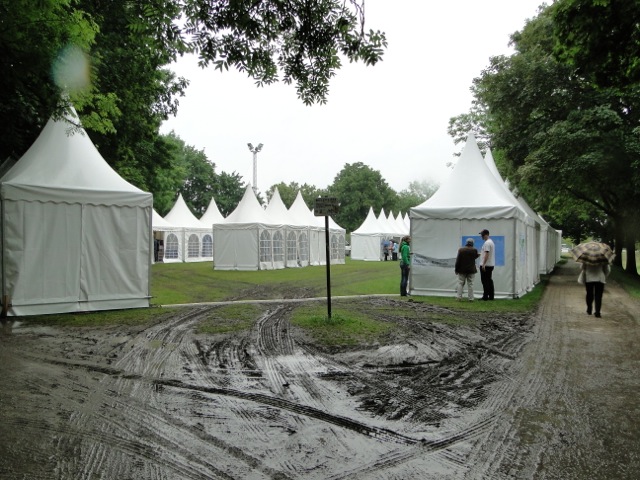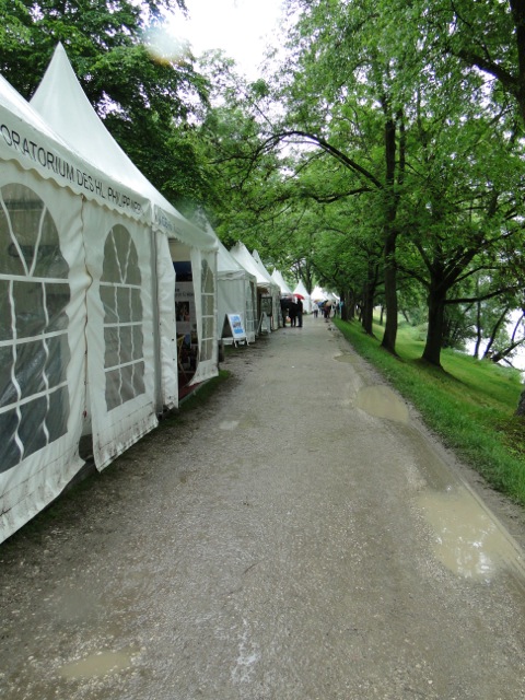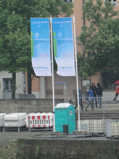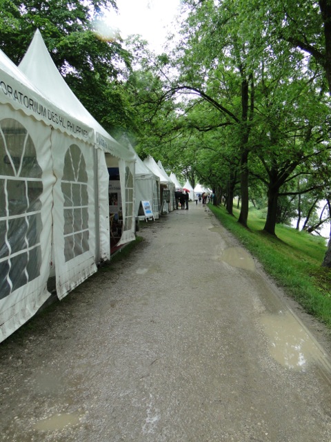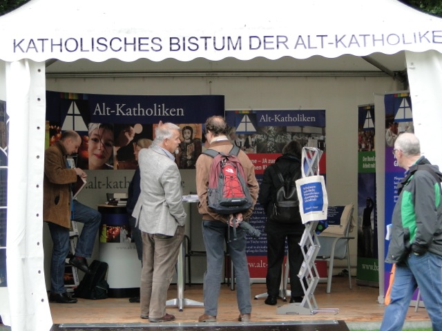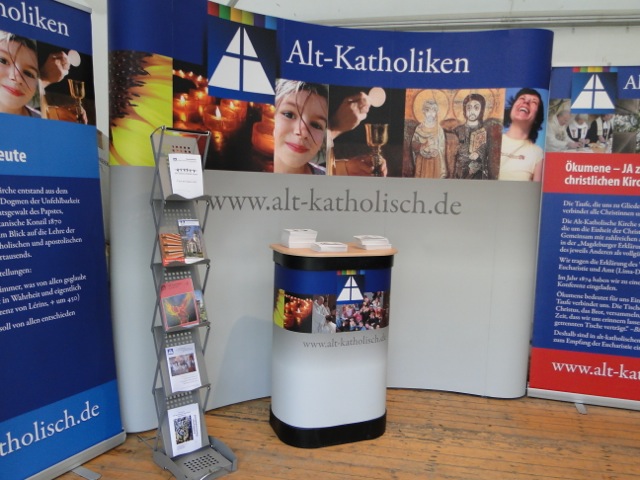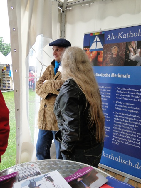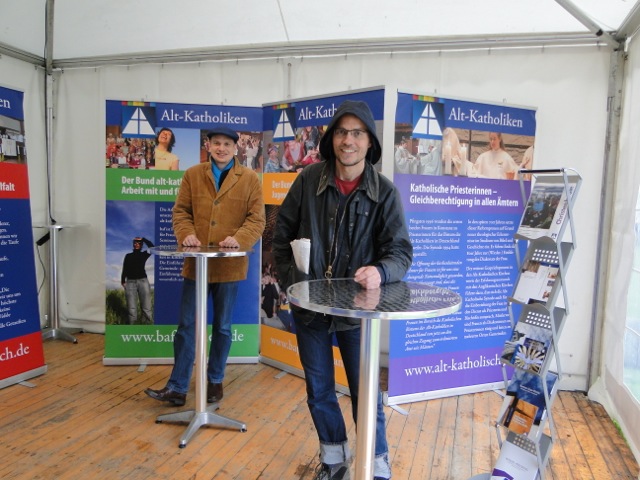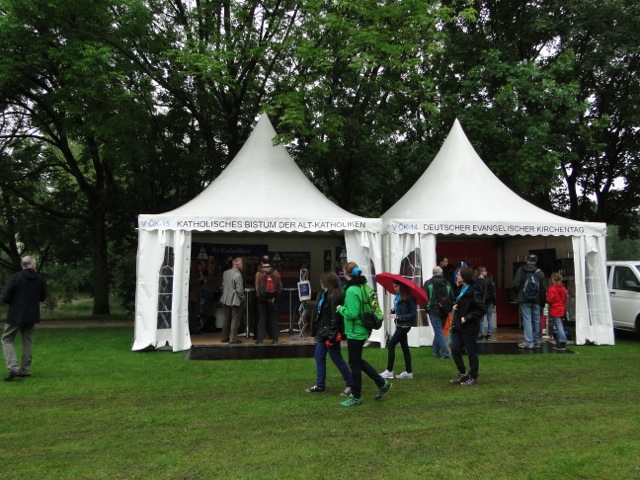 Langsam aber sicher versinkt die Katholikentagsmeile am Grießer Spitz, wo wir von der alt-katholischen Kirche unseren Stand haben, im Schlamm. Ich finde es dabei überaus erstaunlich, wie viele Menschen durch aufgeweichte Wege und über sich in Matsch verwandelnde Wiesen dennoch zu uns an den Stand finden.