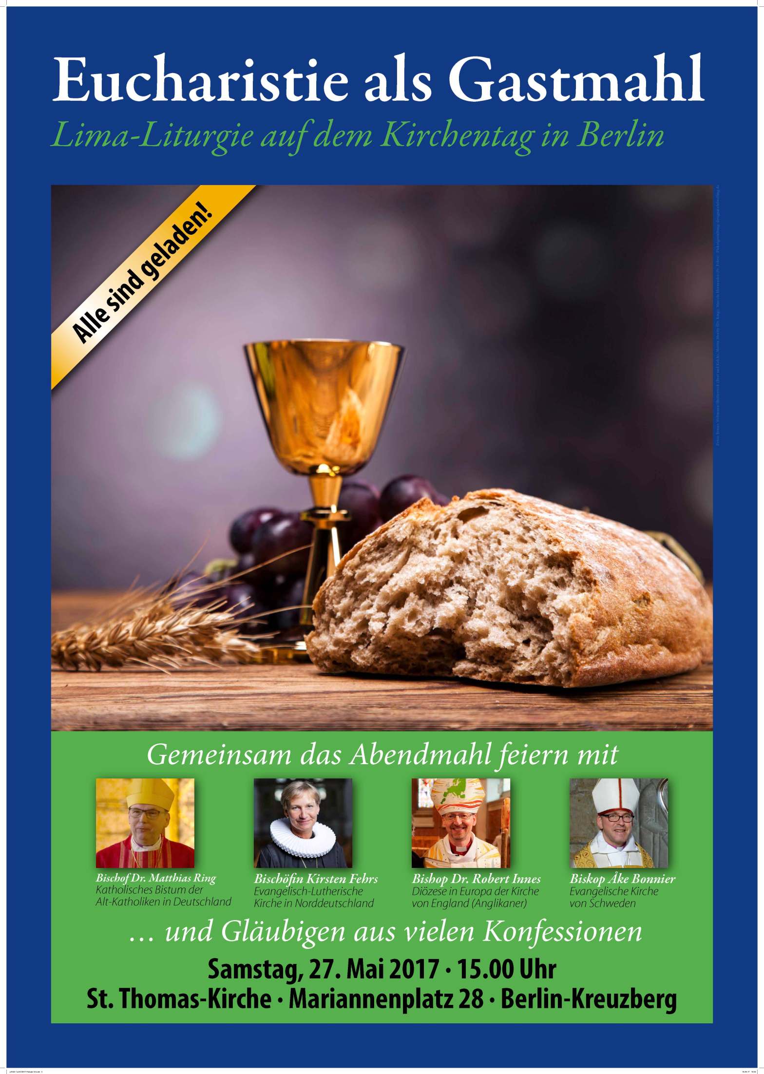 Eucharistie als Gastmahl. Lima-Liturgie auf dem Kirchentag in Berlin. Gemeinsam das Abendmahl feiern mit Bischöfin Kirsten Fehrs (Nordkirche), Bischof Dr. Robert Innes (Diözese der Kirche von England in Europa / Anglikaner), Bischof Åke Bonnier (Evangelische Kirche von Schweden) und Bischof Dr. Matthias Ring (Katholisches Bistum der Alt-Katholiken in Deutschland).